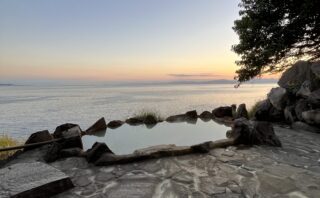 波穏やかな鹿児島湾、鏡のように空を映し出す早朝の露天風呂。さくらじまホテルで体験した幻想的なひとときをレビュー。閉業が悔やまれる素晴らしい宿の魅力を紹介。