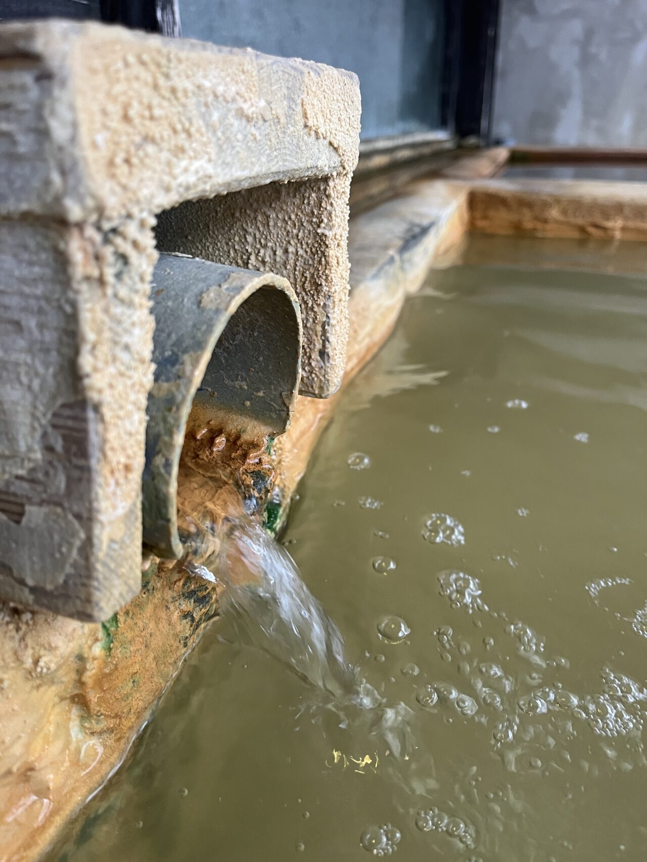 「温泉」黄色い濁り湯の温泉とサイダー冷泉