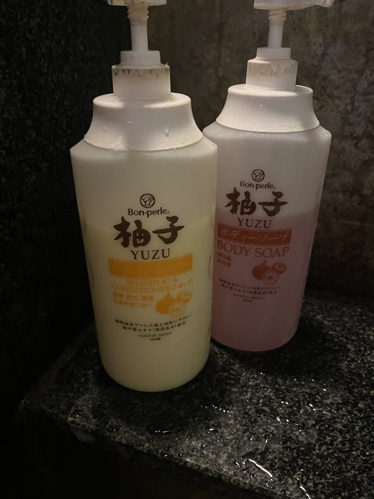 洗い場はご覧のように4か所ほどありました。アメニティもゆずの香り漂うものでしたね。