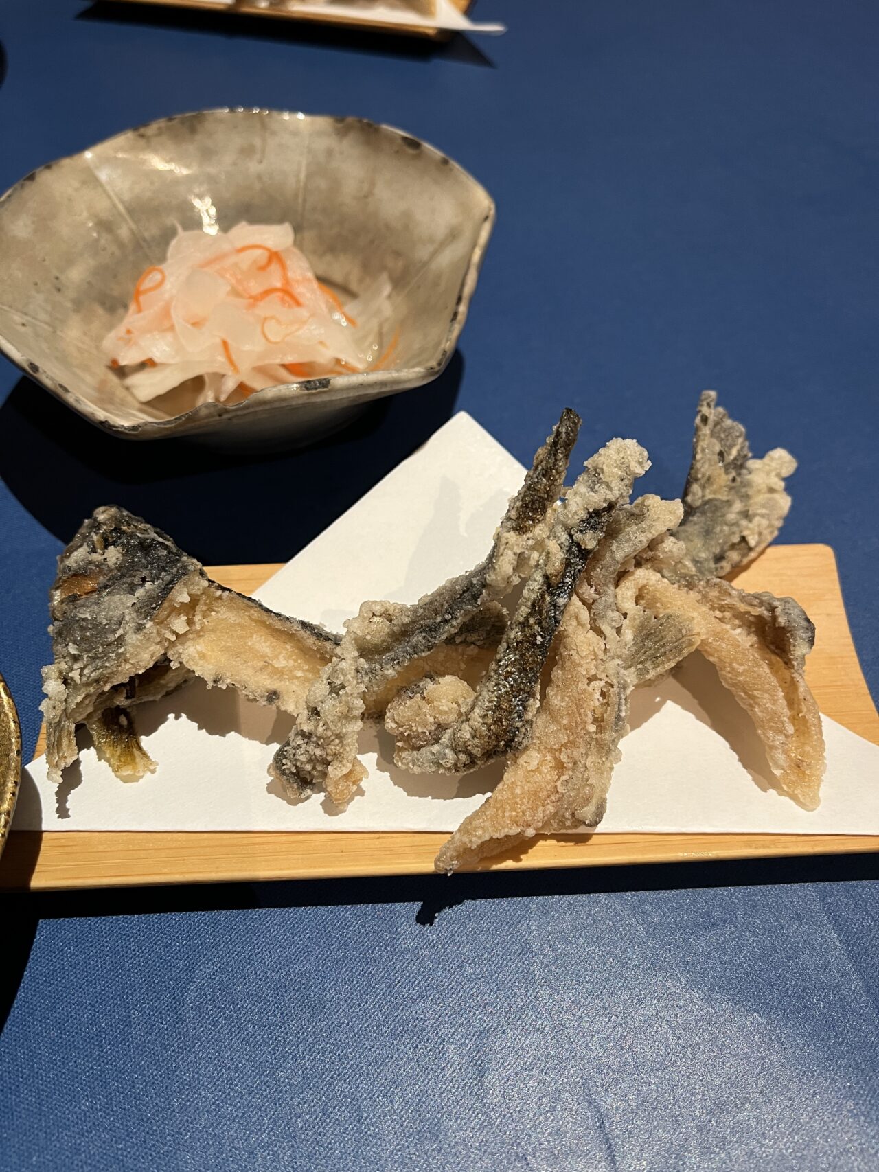 こちらはエノハの骨せんべい。ハードに揚げてるので骨までいただけるパリパリ間がお酒に合う料理。