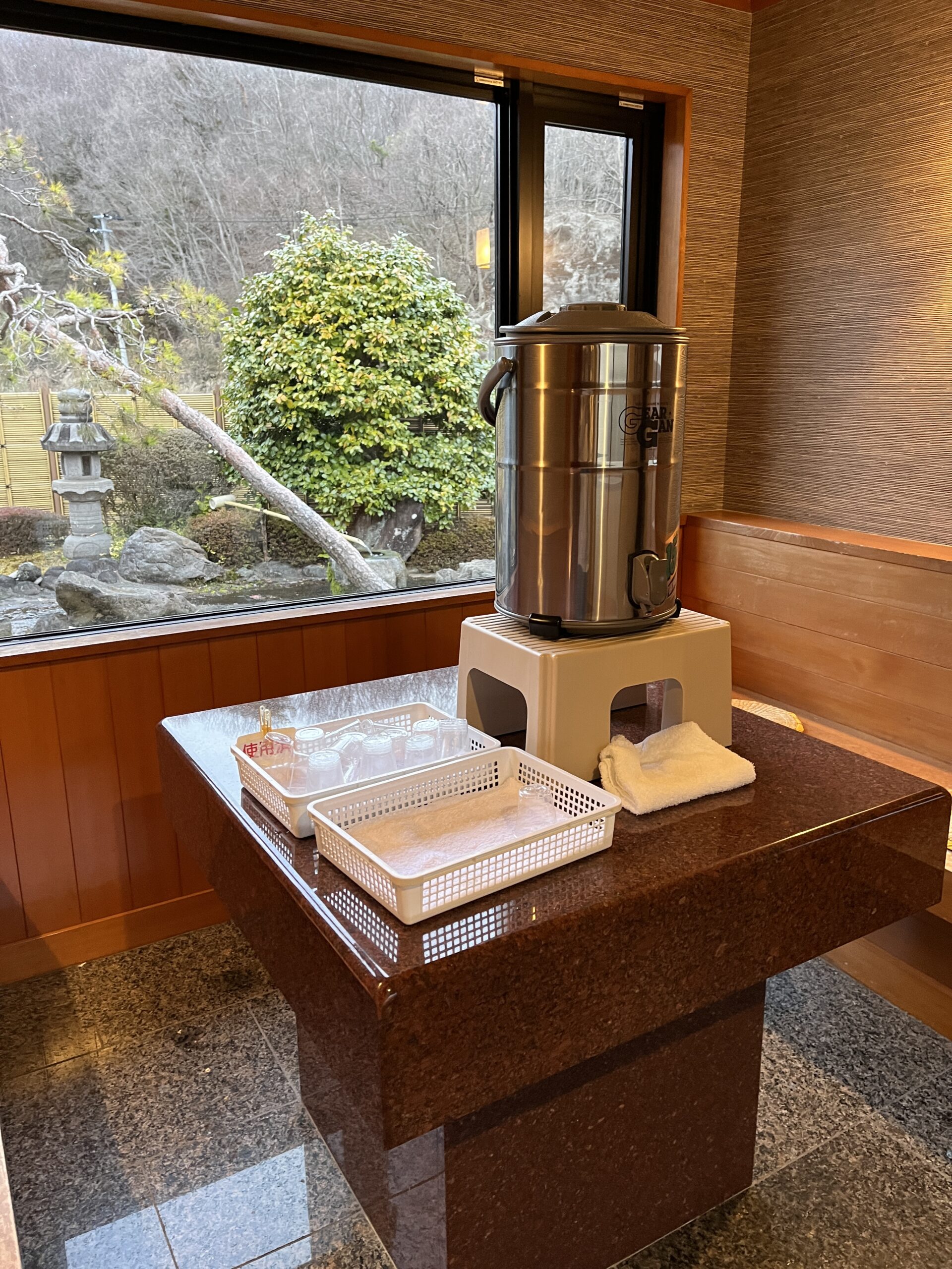 湯上りにはいつでも飲める冷たい水が常備されており、これも大変ありがたい心遣い。