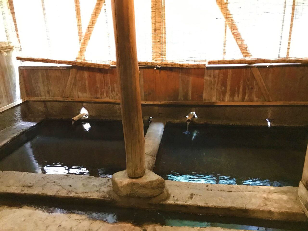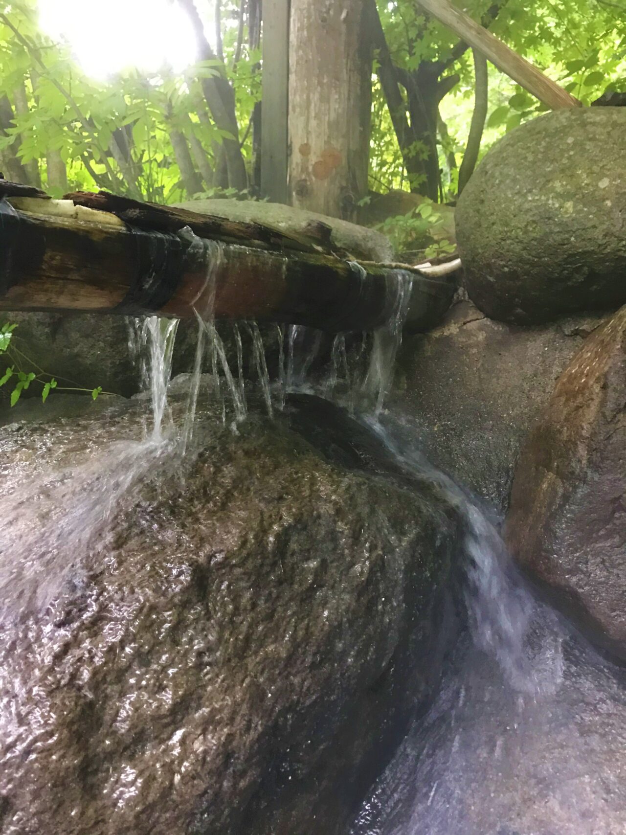 くりぬいた木から温泉が流れてきますが、あまりの量にあふれちゃってます。すごいです。