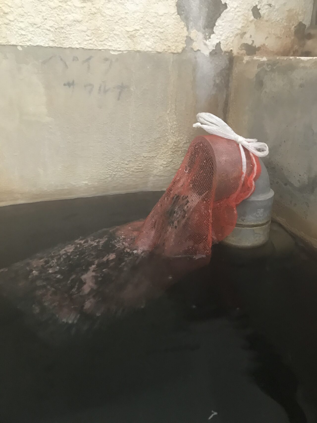 お湯の中にも黒っぽい湯の花が浮いていて、袋でキャッチできないぐらいの量が出ているようです。