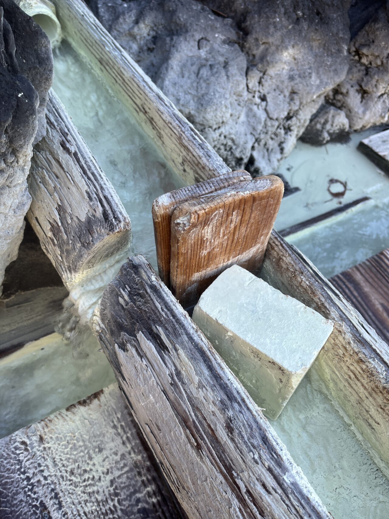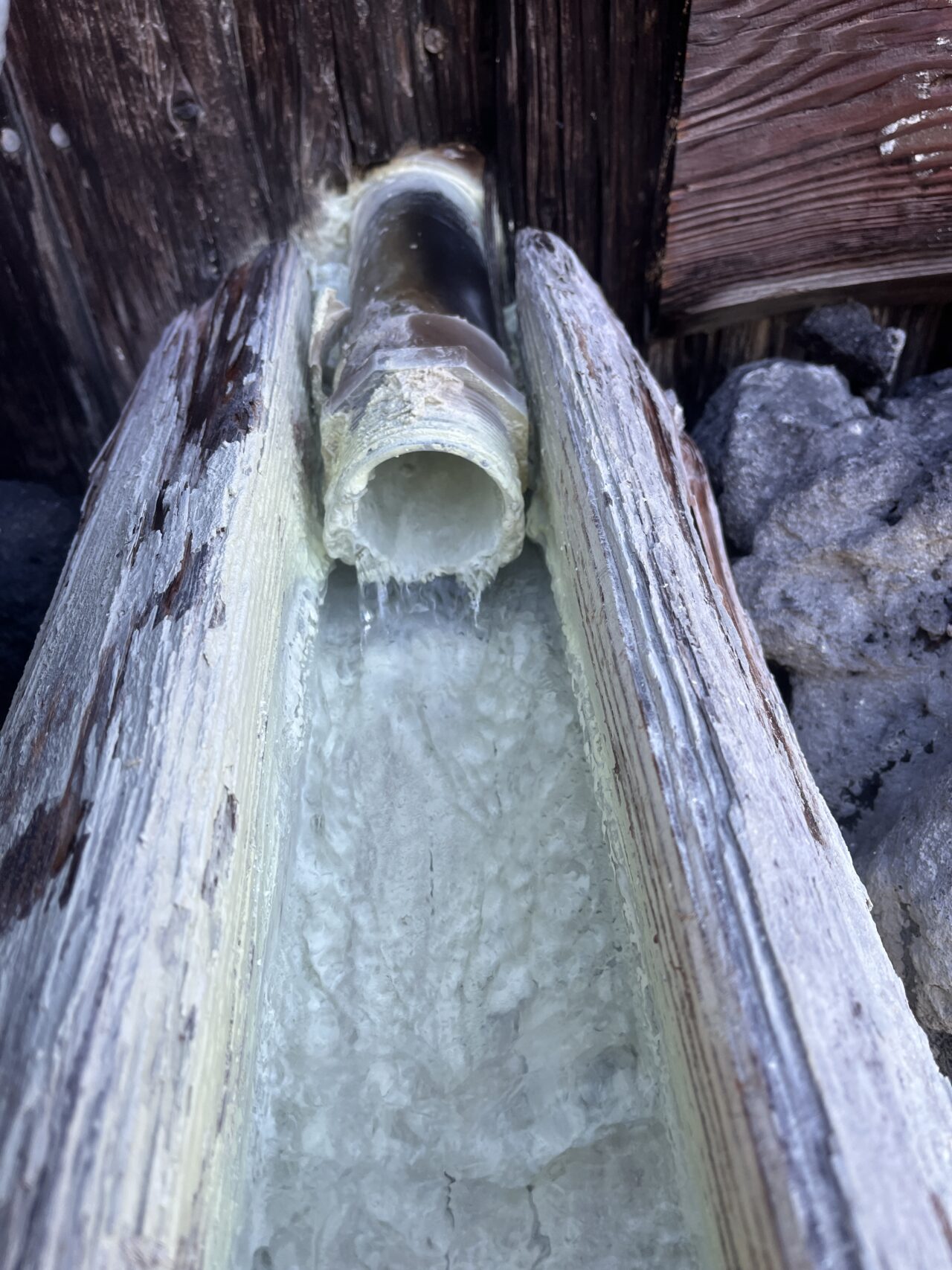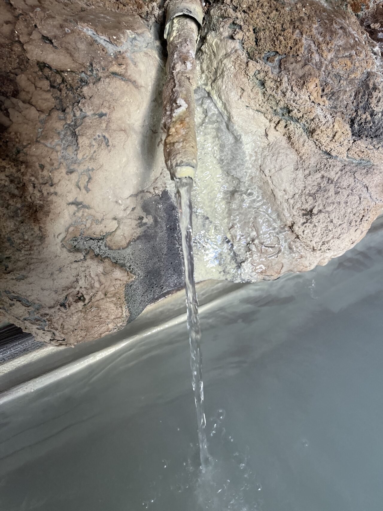 析出物でコーティングされた湯口から新鮮な源泉が投入!
