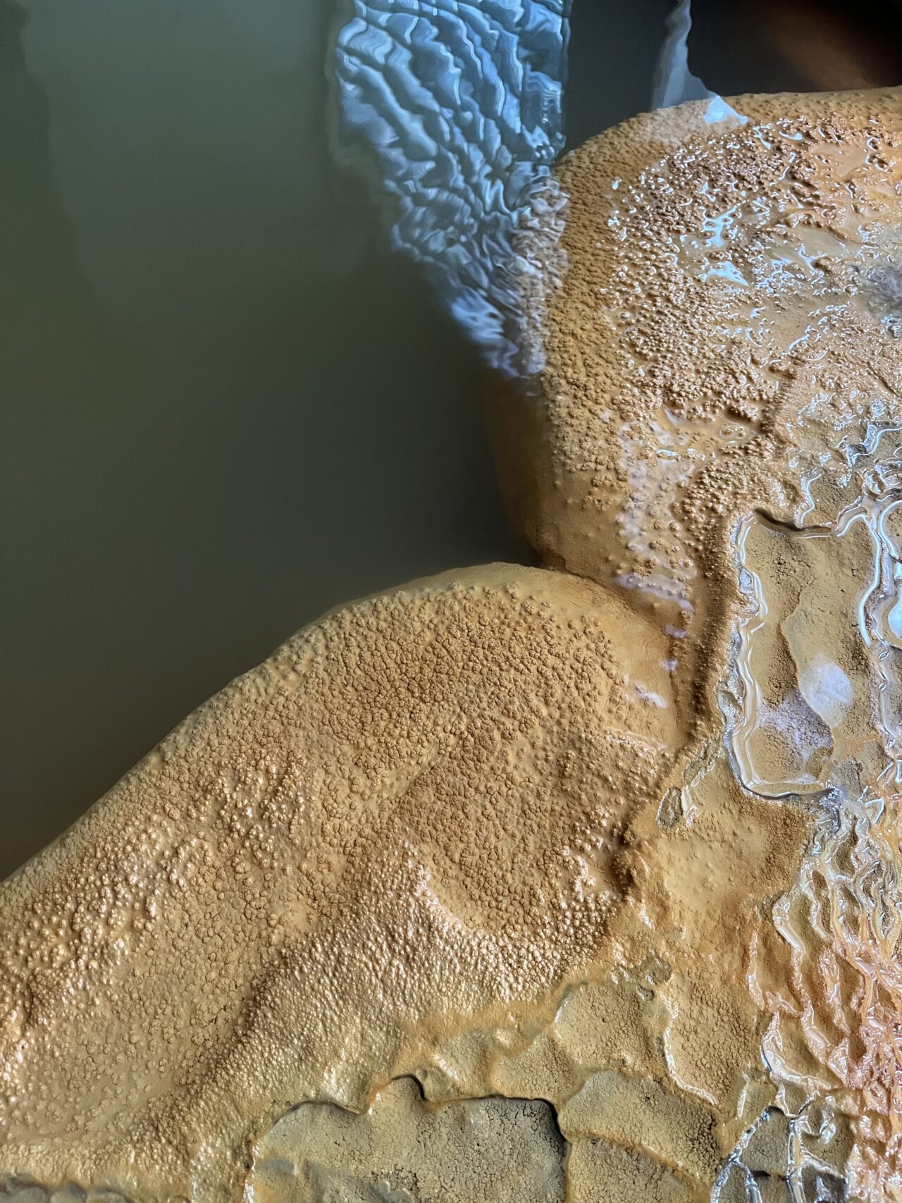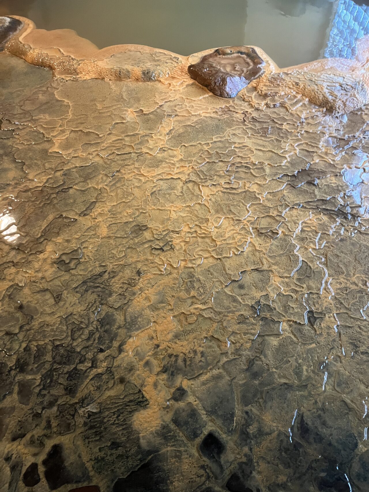 床には長年かけて形成された温泉の成分が固まっていました。自然の芸術!