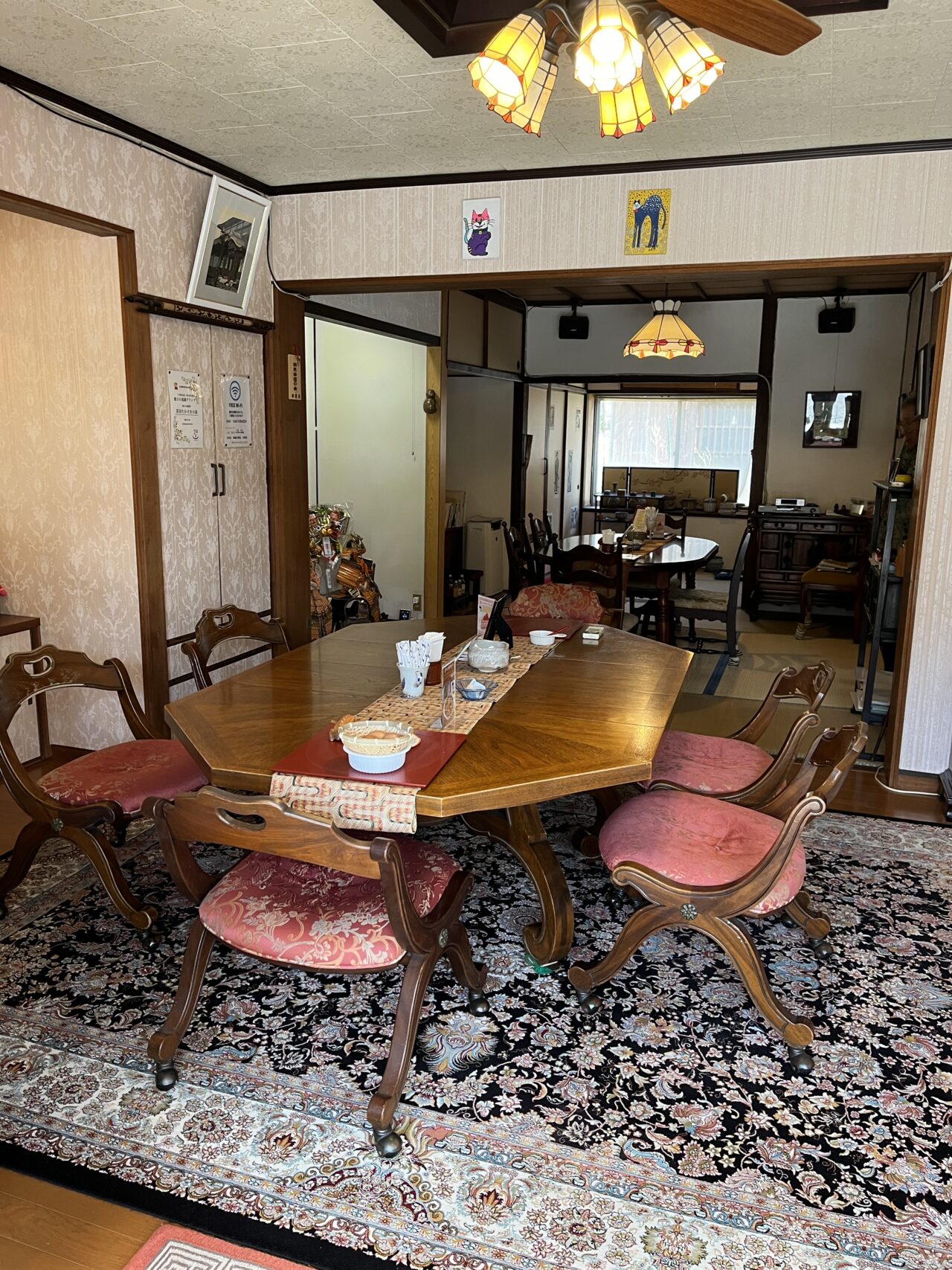 中に入るとおしゃれないすや机、奥には畳と和洋折衷な内装。