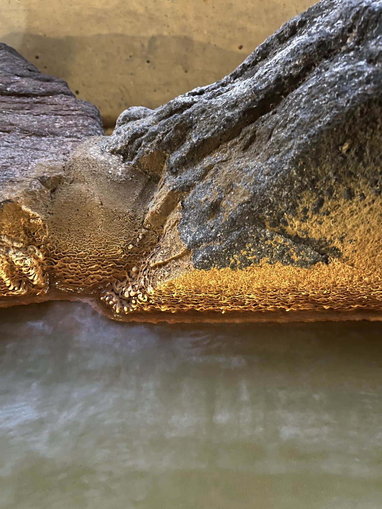 岩にはミルフィーユのように層になっている析出物が見られました。