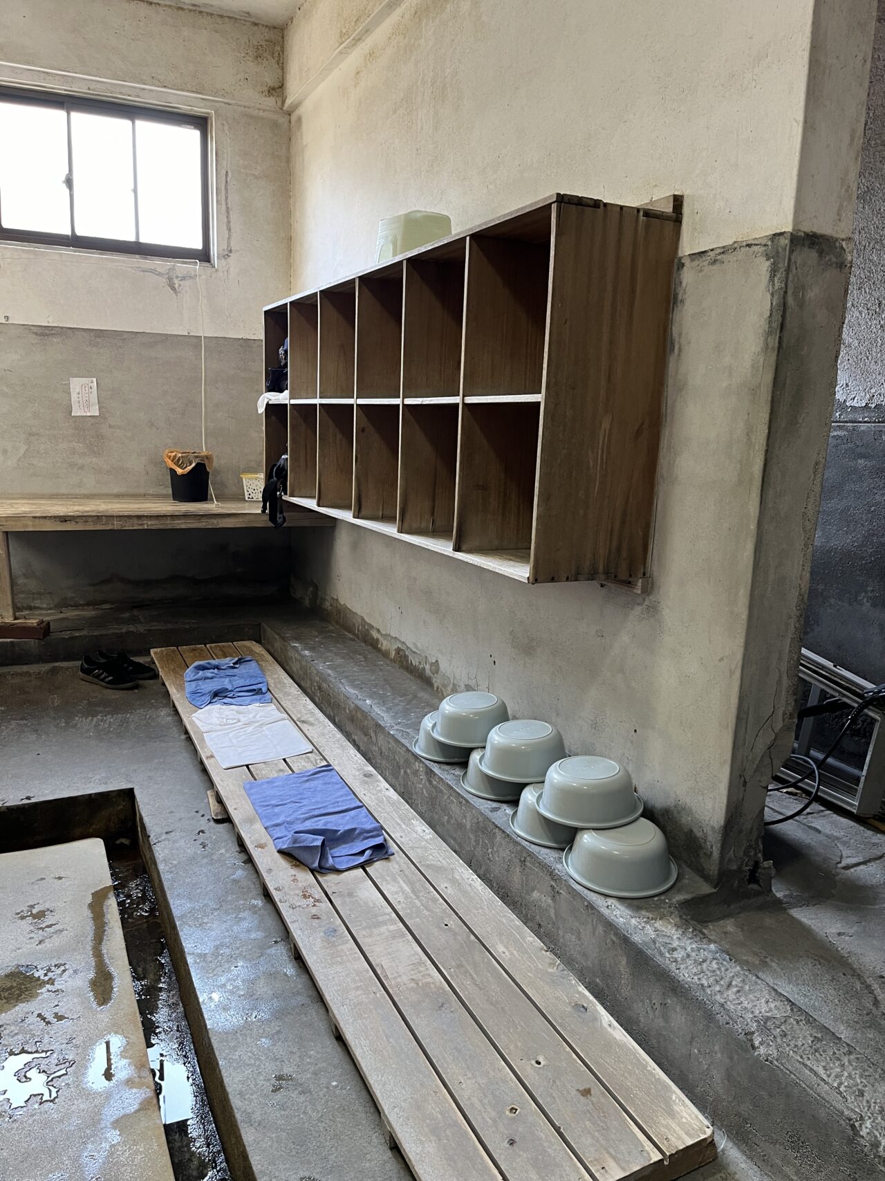 扉を開けると、まず簡易的な脱衣所が迎えてくれます。棚があるだけのシンプルな作りで、余計なものは何もない。それがむしろ清々しい。