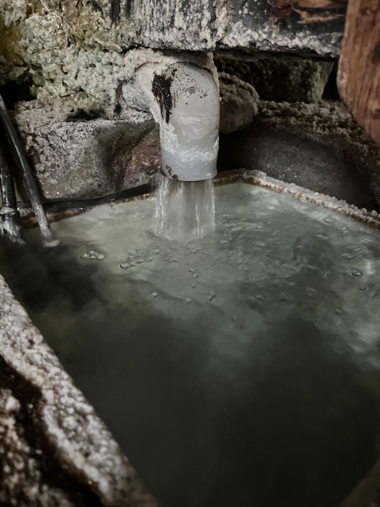源泉はこちらの塩ビ管から豊富な量が流れます。