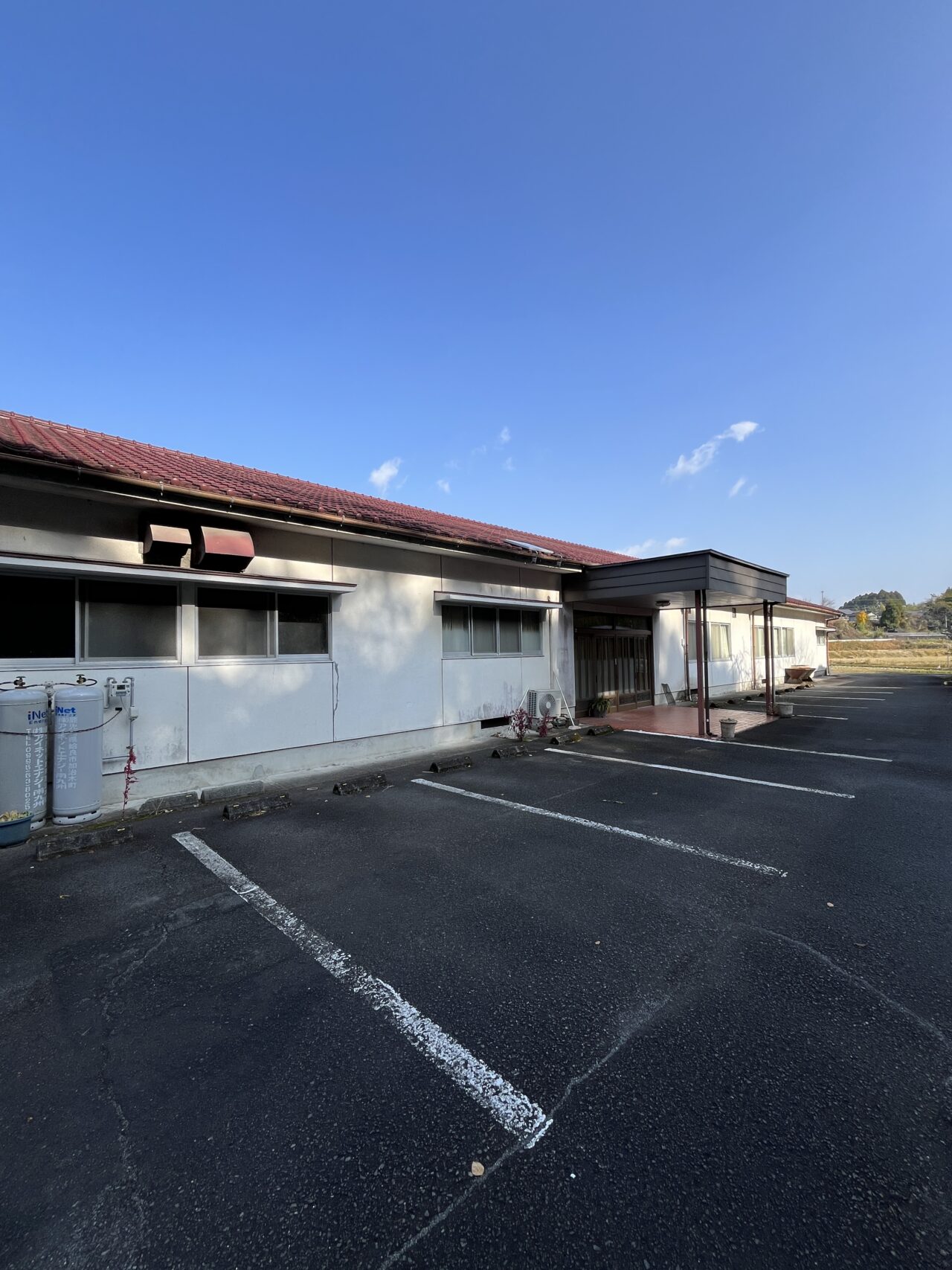 平たい公民館のような雰囲気で、イメージするビジネスホテルの外観とは全く異なるもの。